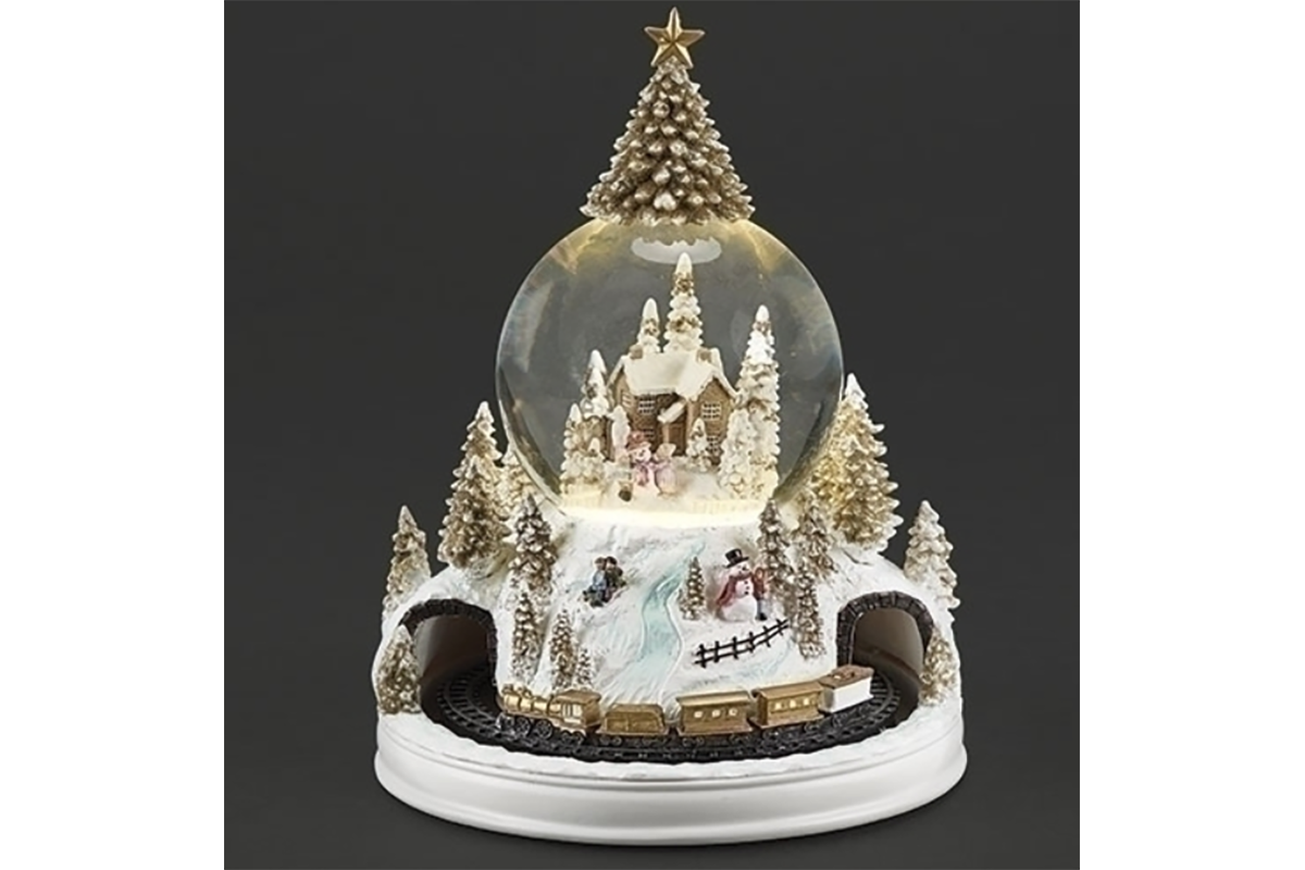 11"H LIGHTED MUSICAL DOME GOLD TREES, TRAIN ROTATING; 120mm. GLASS/RESIN.