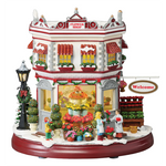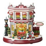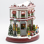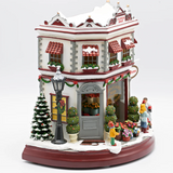 Bring elegance and cheer to your holiday village with this glowing Flower Shop scene. Trimmed with garlands and wreaths, the shop’s windows shine with warm light, showcasing colorful arrangements inside. Outside, figures gather to share flowers, while a wreath-adorned lamp post and snowy details complete the festive charm. Perfect for collectors and holiday decorators alike, this piece captures the warmth and beauty of the season in a timeless village setting. Flowers rotate inside window.