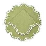 Set a beautiful table with sage napkins elevated with crisp white wavy, scalloped embroidery. This timeless design brings charm to every dining occasion.
