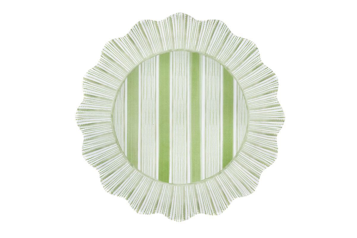 Reminiscent of a sunburst, we’ve added a radiant ruffle trim in vibrant and happy hues to the classic cabana stripe—making this chic and shatterproof dinner plate a splash more special, feminine, and fun.