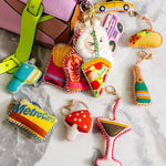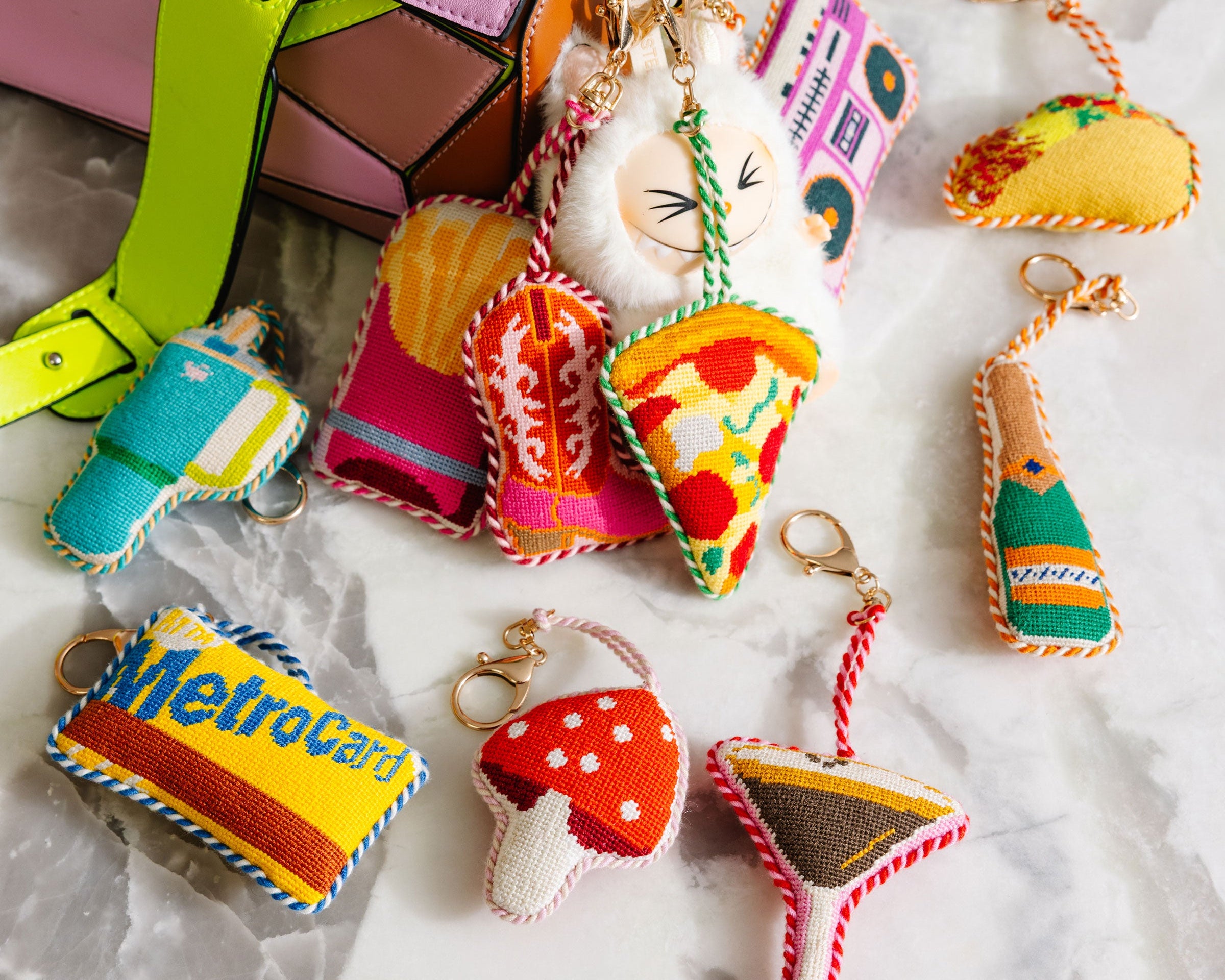 For the ones who know that accessories should never be boring. These needlepoint bag charms are for those who say, ‘Why blend in when you can carry a tiny taco?’ Whether it’s a taxi, a Stanley cup, or something cheeky, clip on your personality and let your bag do the talking.