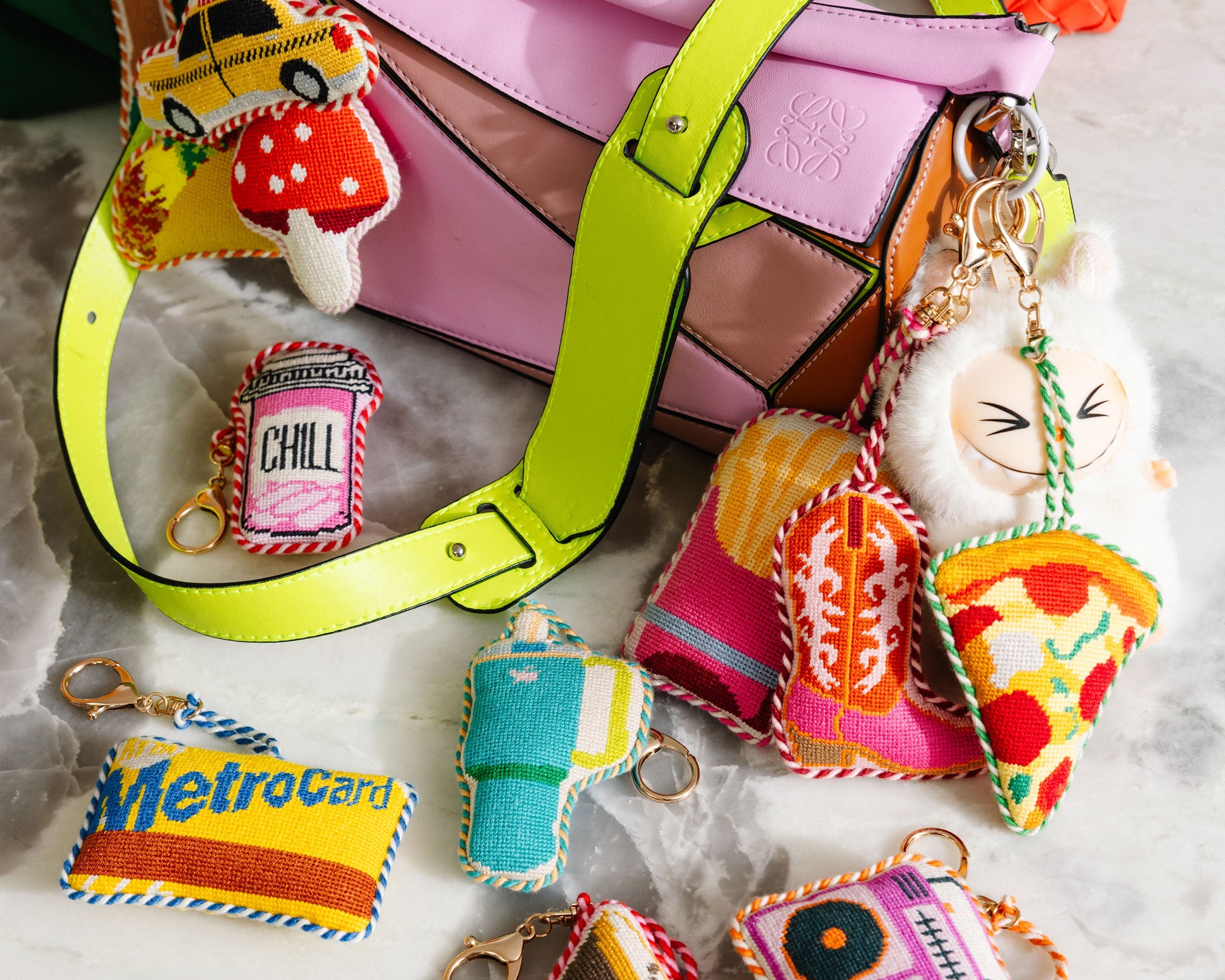 For the ones who know that accessories should never be boring. These needlepoint bag charms are for those who say, ‘Why blend in when you can carry a tiny taco?’ Whether it’s a taxi, a Stanley cup, or something cheeky, clip on your personality and let your bag do the talking.