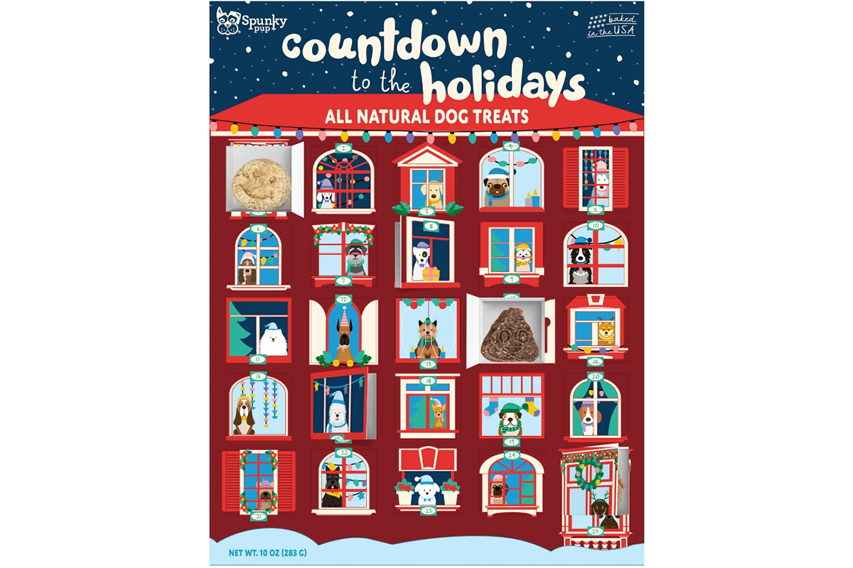 Countdown to Christmas in style Spunky Pup's Countdown to the Holidays Dog Treat Advent Calendar! This pup-tacular calendar comes packed with 25 carefully crafted, hand-baked treats made with real peanut butter and all-natural ingredients for an extra-special treat your doggo is sure to adore. No preservatives or nasties here - just a festive month of delicious surprises! Open a new door each day and watch the excitement build - it's the pawfect way to make your holiday season one to remember. Woof!