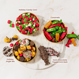 - Holiday candy mix: chocolate bells, peppermint bark, studded bark, and candy corn.
