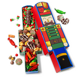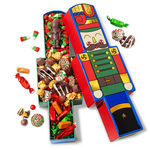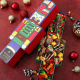 Celebrate the season with this Christmas gift basket — a festive soldier-shaped tin overflowing with holiday-themed chocolate and candy delights. Inside, you'll find milk caramels, a savory-sweet holiday jingle mix, chocolate peppermint bark, and nostalgic holiday candy corn. This compact yet joyful basket is perfect for seasonal gifting or cheery snacking.