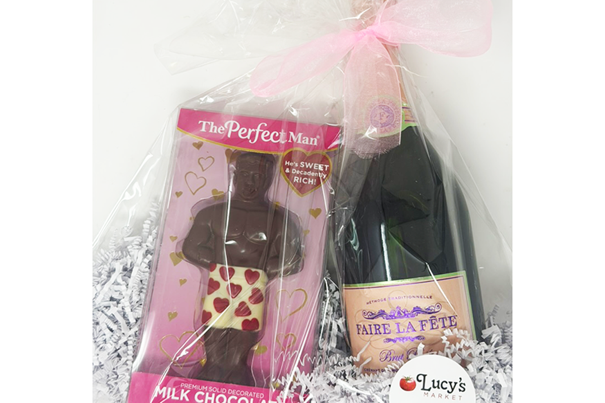 Give this fun gift to your Galentines! With a milk chocolate "perfect man" and a bottle of champagne, it will be a hit!