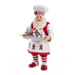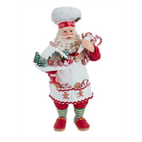 Tray - This 11" Santa features Santa wearing an apron decorated with gingerbread men and chef's hat with a holly berry accent. Santa is carrying a tray of frosted gingerbread desserts.
