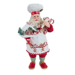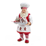 Candy Cane - This 10.5" Santa features Santa wearing an apron decorated with gingerbread men and a chef's hat with a "Merry Christmas" ribbon border. Santa is carrying a decorated gingerbread house and candy canes.