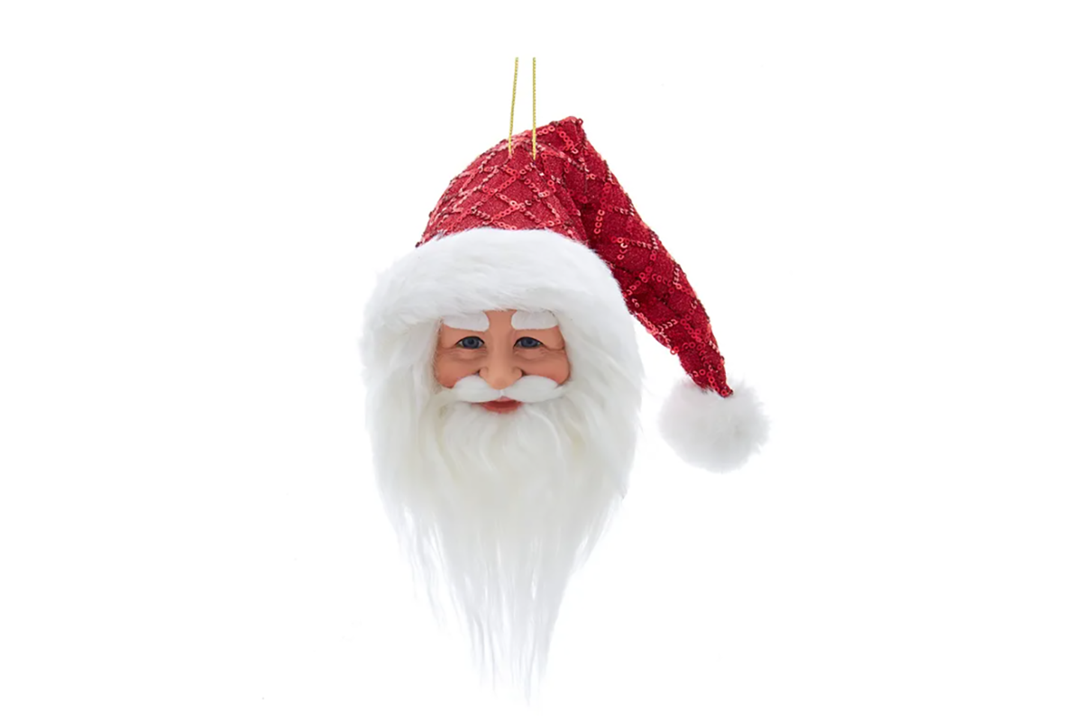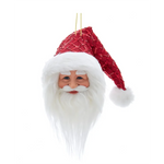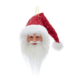 Red Santa Head - (not glass) Bring classic holiday cheer to your Christmas tree with Kurt Adler's charming Red Santa Head Ornament. Featuring a beautifully detailed Santa Claus face, complete with a fluffy white beard, rosy cheeks, and his iconic red hat trimmed with faux fur, this ornament adds a touch of warmth and nostalgia to your holiday décor. Crafted with care and vibrant colors, it captures the joyful spirit of Santa and the magic of the season. Perfect for hanging on your tree, wreaths, or garlands, this Santa head ornament is a delightful addition to any festive display. It also makes a great gift for those who love traditional Christmas décor. 9".