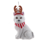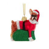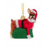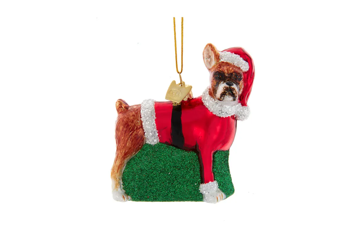 Boxer in Santa Suite - A Boxer is featured wearing with a red and white glittered Santa with a matching glitters Santa hat. 3.25". Glass