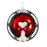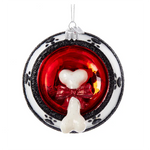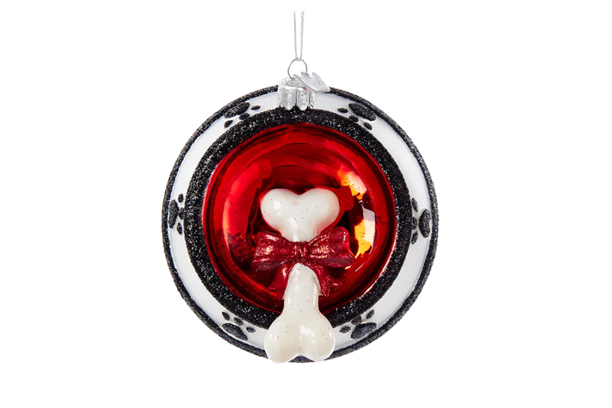 Dog bowl - This Kurt Adler Noble Gems™ dog bone in bowl ornament is a beautiful addition to any holiday decor or Christmas tree. This ornament features a white dog bowl with black glitter accents with a dog bone wrapped in a bright red ribbon resting in the bowl. 4.25". Glass