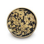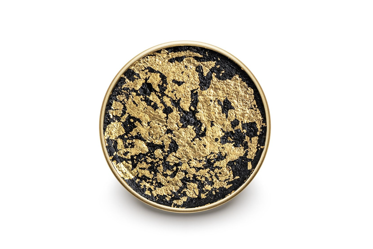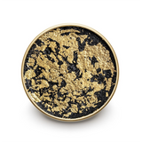 - Dark gray to black caviar paste topped with edible 24k gold leaf.