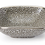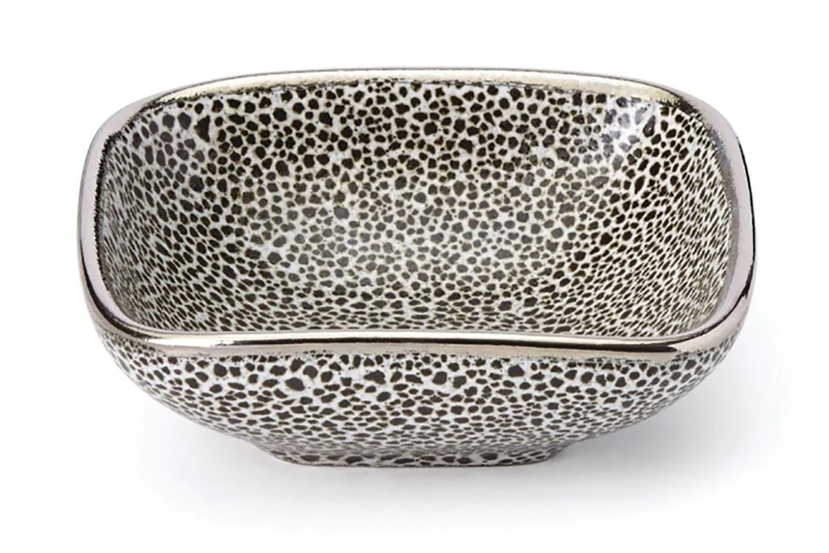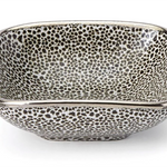 Panthera's reactive glaze means no two pieces will ever be exactly the same. The Japanese philosophy of Wabi Sabi, or the beauty of imperfection, radiates from this collection. The glaze creates variances, such as the size and quantity of spots, which is part of the beauty of the piece. The Panthera collection is stoneware, hand-finished with platinum. dishwasher safe, not for use in a microwave