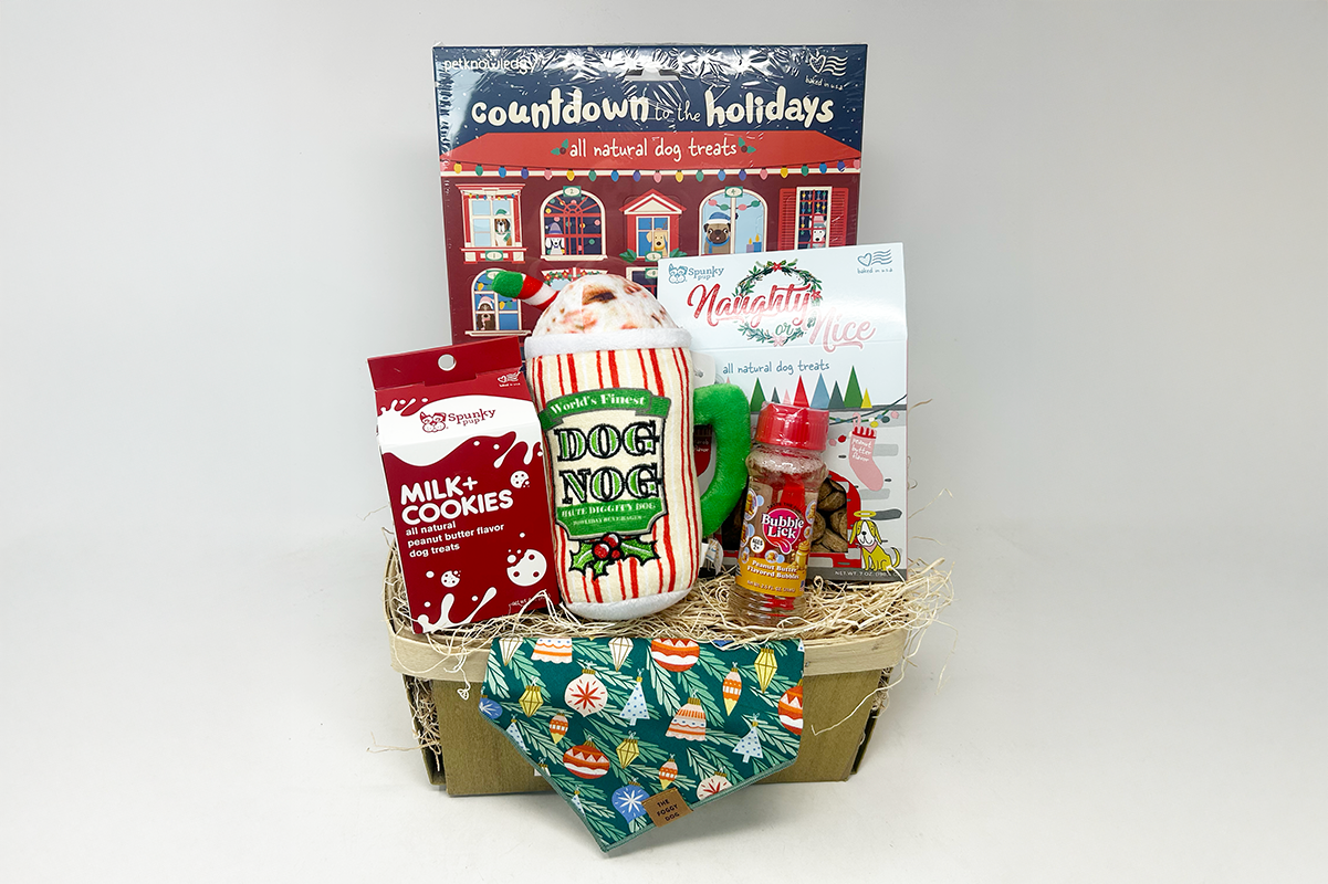 Pamper your beloved pet this holiday season with our Santa Paws basket! It features a dog advent calendar, delicious treats, a fun toy, and more!
