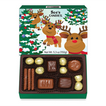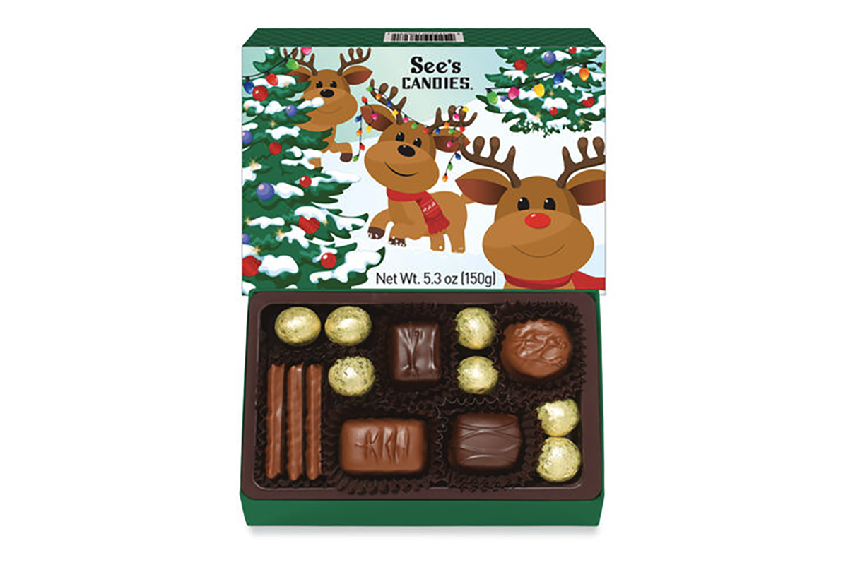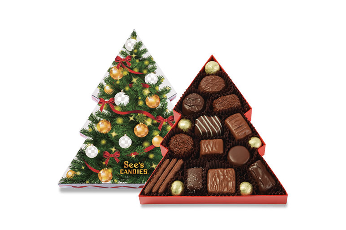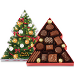 Oh Christmas Tree Box - This elegant, tree-shaped box is brimming with a rich assortment of milk and dark chocolate favorites. Approximately 19 pieces*: Milk Gold Foil Balls (5), Light Chocolate Truffle, Dark Chocolate Buttercream, Milk Mocha, Milk Butterscotch Square, Milk Bordeaux™, Raspberry Truffle, Dark Vanilla Buttercream, Milk Butterchew®, Milk Molasses Chips (3), Dark Salted Caramel, Milk California Brittle ®, Dark Almond Nougat.