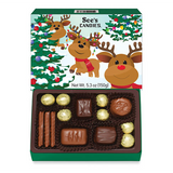 Christmas Buddy Box - Indulge in this delightfully playful box full of premium milk and dark chocolates. Approximately 14 pieces*: Milk Molasses Chips (3), Milk Gold Foil Balls (7), Milk Butterscotch Square, Dark Butterchew®, Dark Chocolate Chip Truffle, Milk Chocolate Buttercream.