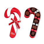 Candy Cane Box - This all-new, candy-cane-shaped box comes tied with a decorative red bow and filled with holiday favorites. Approximately 16 pieces*. Dark Bordeaux™, Milk Red Foil Balls (6), Dark Chocolate Buttercream, Dark Silver Foil Balls (4), Milk Vanilla Buttercream, Dark Raspberry Cream, Café Hazelnut Truffle, Dark Butterchew®.