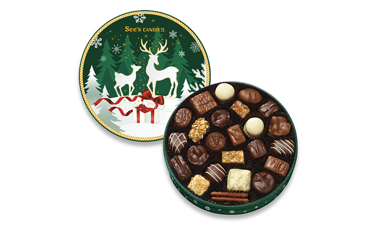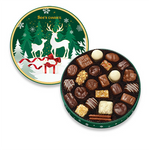 Christmas Wonders Tin - Make spirits bright with this stunning new collectible tin full of premium milk and dark chocolates, truffles and more! Approximately 25 pieces*: Lemon Truffle, Light Chocolate Truffle, Milk California Brittle®, Divinity Puff (2), Milk Divinity, Dark Butterchew®, Milk Almonds, Raspberry Truffle, Milk Butterscotch Square, Milk Molasses Chip (3), Kona Mocha, Dark Almond Nougat, Blueberry Truffle, Cashew Brittle, Dark Chocolate Chip Truffle, Dark Walnut Square, Milk Almond Caramel, Milk Bordeaux™, Toffee-ette®, Dark Almonds (2), Milk Almond Square.