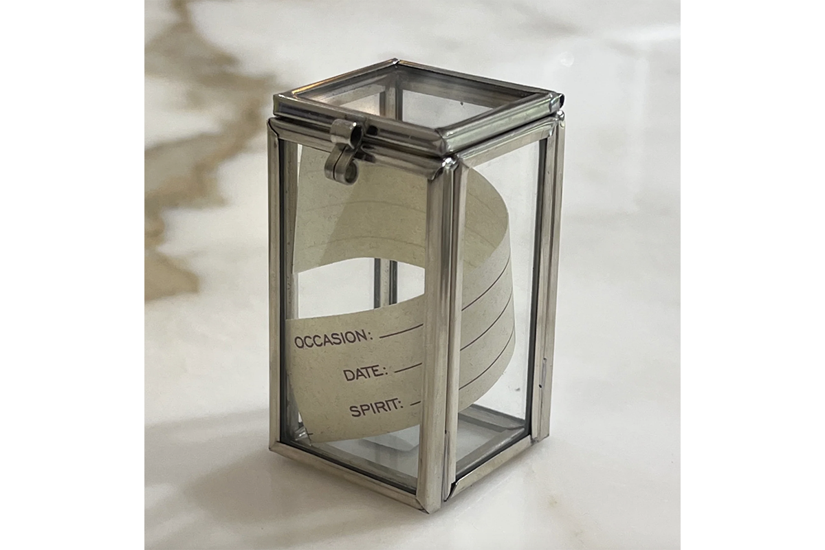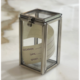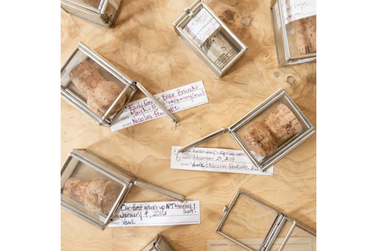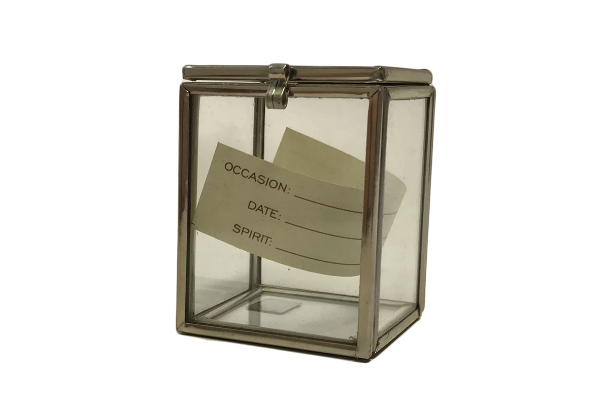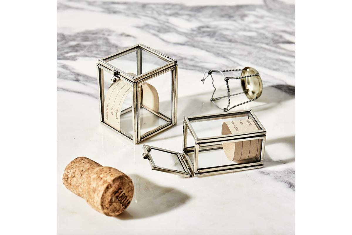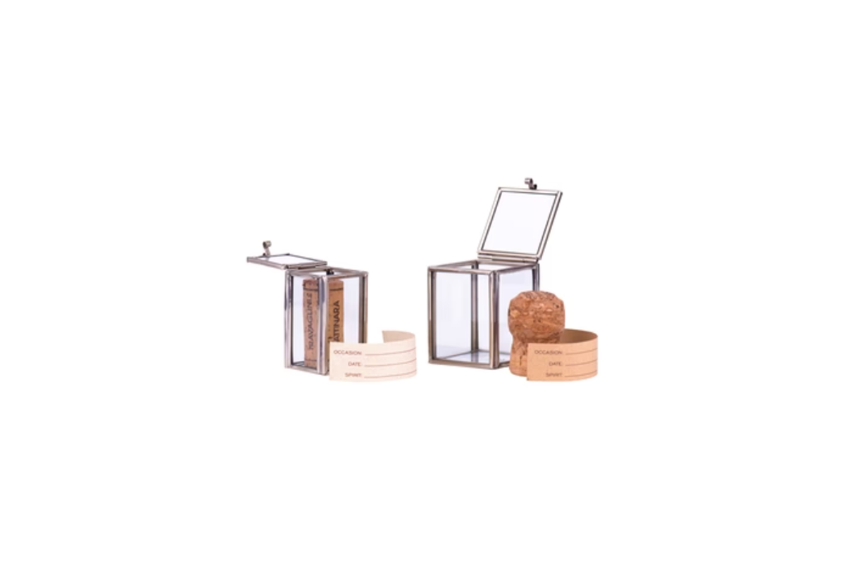 Silver metal with glass panes. To keep the corks from special moments of your life. Comes with a note to write down the occasion, date and spirit.